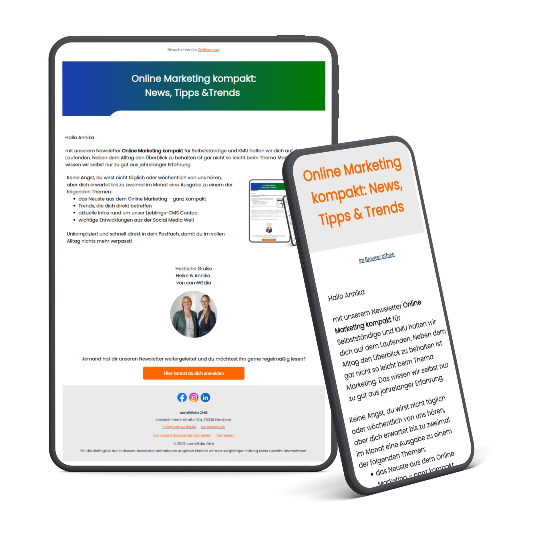 Mit unserem Newsletter Online Marketing kompakt für Selbstständige und KMU halten wir dich auf dem Laufenden. Neben dem Alltag den Überblick zu behalten ist gar nicht so leicht beim Thema Marketing. Das wissen wir selbst nur zu gut aus jahrelanger Erfahrung.