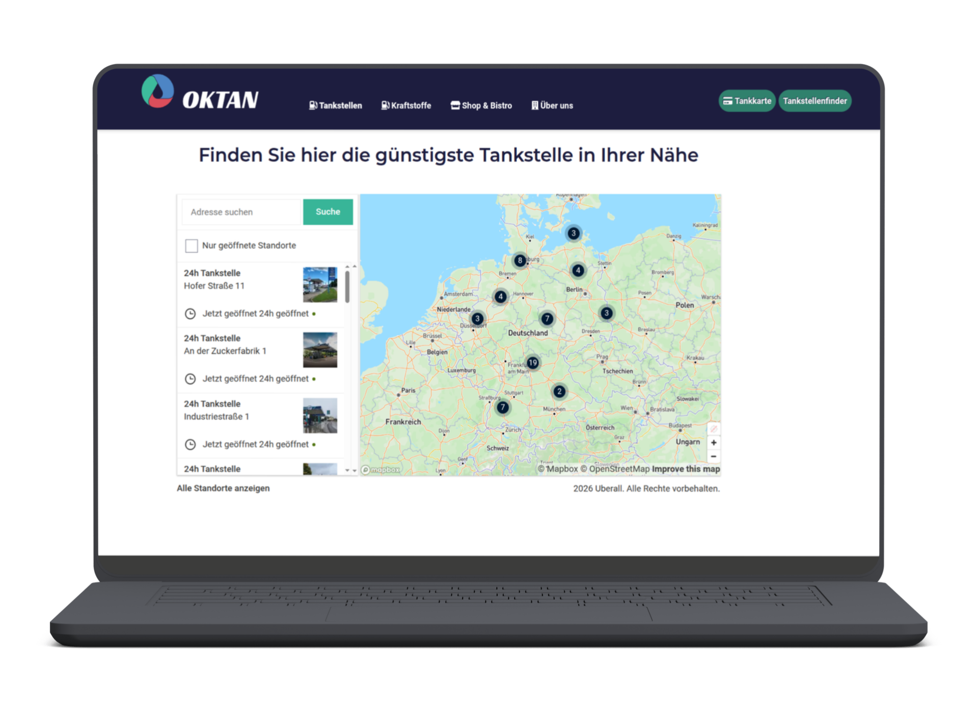 Als ersten Schritt in Richtung Optimierung und Modernisierung wurde die Einbindung einer neuen Listing-Lösung für die Darstellung der Tankstellen von Oktan durchgeführt. Durch einheitliche Daten auf verschiedenen Plattformen wird das lokale SEO nachhaltig gesteigert und gleichzeitig wird die Pflege der Daten an einem Ort gebündelt. Wir haben das neue Tool als externes Modul in die Website integriert und optisch an das vorhandene Design angepasst.